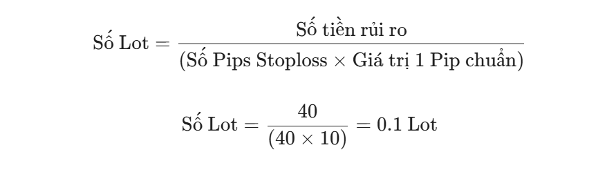 => Kết luận: Với tài khoản $2,000 và Stop Loss 40 Pips, bạn chỉ được phép vào tối đa 0.1 Lot. Nếu bạn vào 1 Lot, bạn đang đánh bạc, không phải đầu tư.