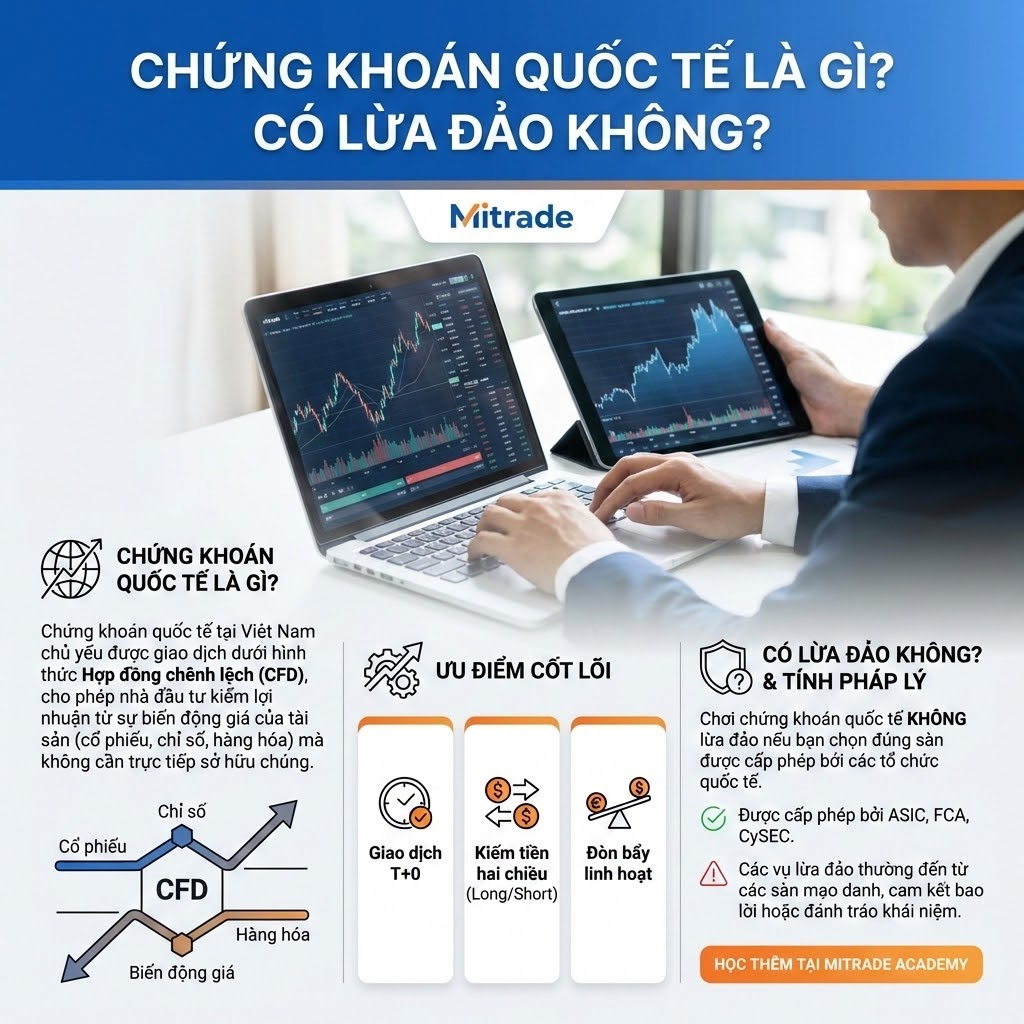 • Tính pháp lý: Chơi chứng khoán quốc tế KHÔNG lừa đảo nếu bạn chọn đúng sàn được cấp phép bởi các tổ chức quốc tế (ASIC, FCA, CySEC). Các vụ lừa đảo thường đến từ các sàn mạo danh, cam kết bao lời hoặc đánh tráo khái niệm.