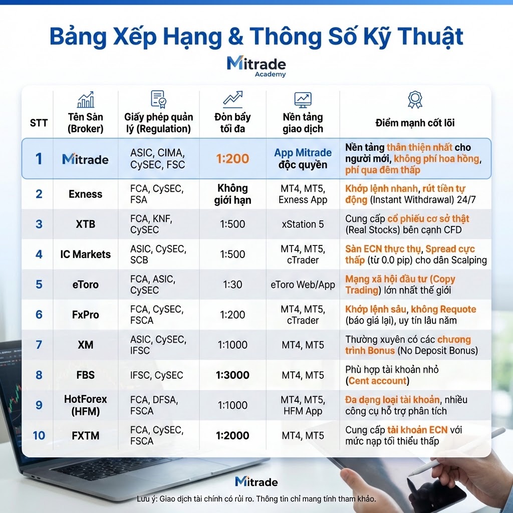 Dưới đây là danh sách cập nhật 10 sàn môi giới CFD quốc tế an toàn nhất cho trader Việt Nam, được đánh giá dựa trên tiêu chí: Giấy phép pháp lý, chi phí giao dịch, và tốc độ nạp/rút tiền.