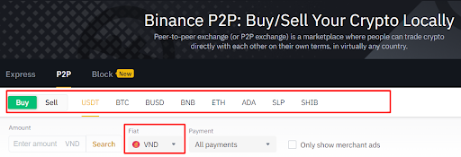 P2P là một phương thức giao dịch ngang hàng giữa hai bên. Theo đó, người dùng có thể đăng bán/ mua các đồng coin trên Binance với số lượng và mức giá mong muốn. Trader có thể mua trực tiếp 08 coin bằng VNĐ, bao gồm USDT, BTC, BUSD, BNB, ETH, ADA, SLP, DOGE.