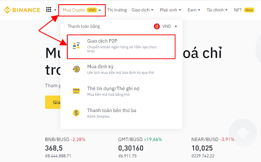 Đăng nhập tài khoản Binance, chọn “Mua Crypto”, chọn tiếp “Giao dịch P2P”.