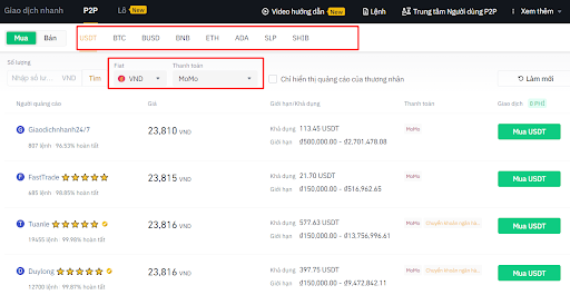 Sau đó chọn đồng coin mà bạn muốn mua, chọn đồng tiền Fiat là “VND”, phương thức thanh toán là “MOMO”. Khi đó nền tảng sẽ hiển thị danh sách những người bán tương ứng.
