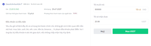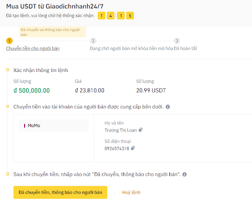 Sau đó ấn “Mua USDT”, lúc này sẽ có thông tin nhận thanh toán từ người bán, bạn cần chuyển khoản cho người bán trong vòng 15 phút để hoàn tất giao dịch.