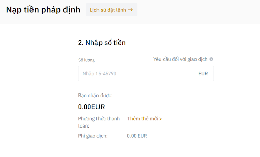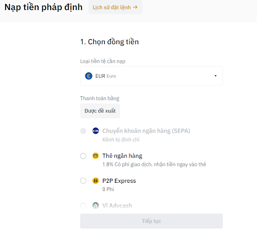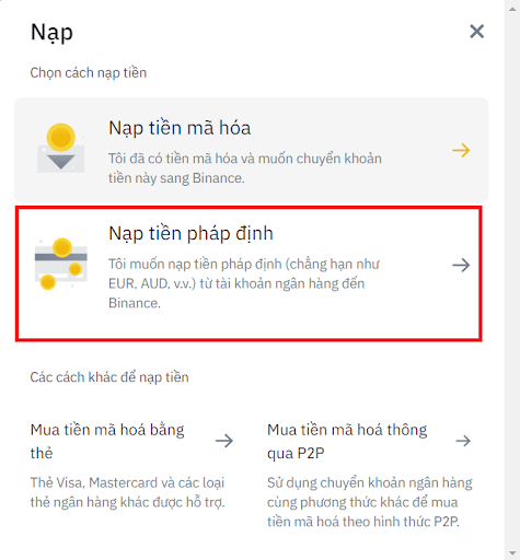 Lưu ý: Đối với phương thức nạp tiền pháp định trực tiếp từ ví Binance thì hiện nay Binance không hỗ trợ đối với VNĐ.