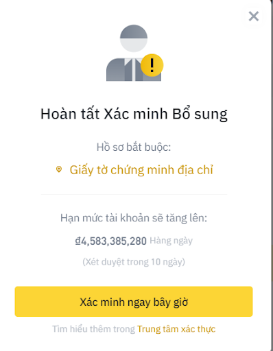 Trong trường hợp bạn muốn tăng hạn mức giao dịch trong ngày thì cần xác minh địa chỉ.