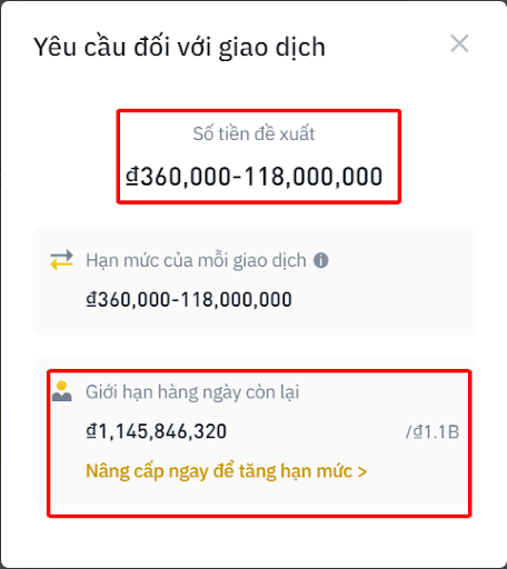 Lưu ý: Đối với giao dịch bằng thẻ Visa/ Mastercard, Binance có giới hạn đối với mỗi giao dịch (360.000 – 118.000.000/ lần giao dịch) và hạn mức giao dịch trong một ngày (1.145.846.320 VNĐ/ ngày).