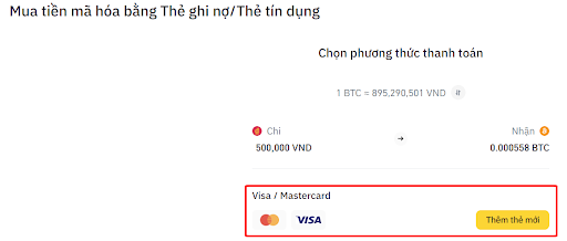 Trader có thể sử dụng thẻ tín dụng (Visa/ Mastercard) để mua coin tại Binance. Với cách này thì người giao dịch thường chịu mức phí khá cao ~ 2%/ giá trị giao dịch.
