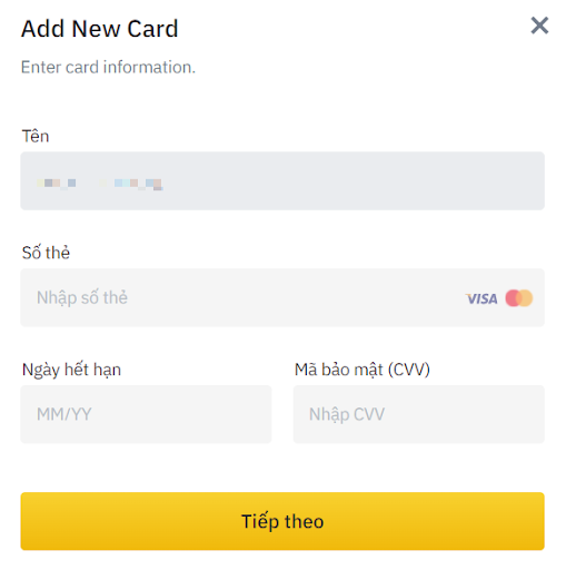 Lưu ý: Đối với thẻ Visa/ Mastercard thì tên thẻ phải trùng khớp với tên đăng ký khi mở tài khoản Binance.