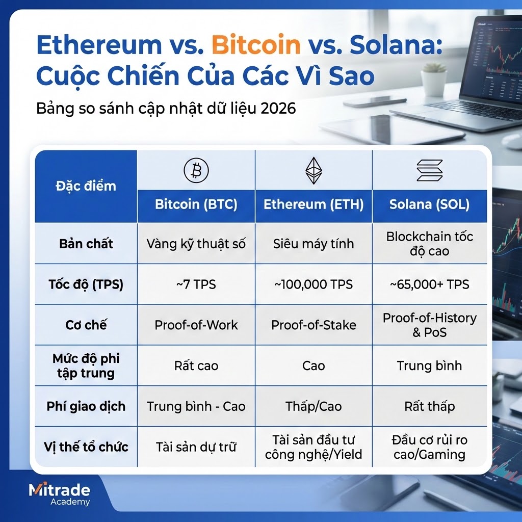 Nhà đầu tư thường phân vân nên mua BTC, ETH hay các “ETH Killer” như Solana. Dưới đây là bảng so sánh cập nhật dữ liệu 2026: