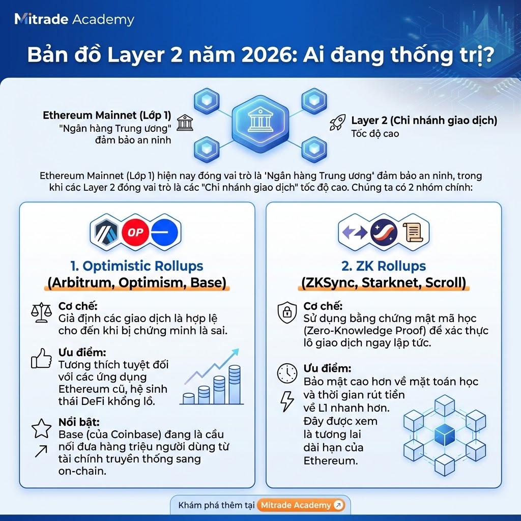Ethereum Mainnet (Lớp 1) hiện nay đóng vai trò là “Ngân hàng Trung ương” đảm bảo an ninh, trong khi các Layer 2 đóng vai trò là các “Chi nhánh giao dịch” tốc độ cao. Chúng ta có 2 nhóm chính: